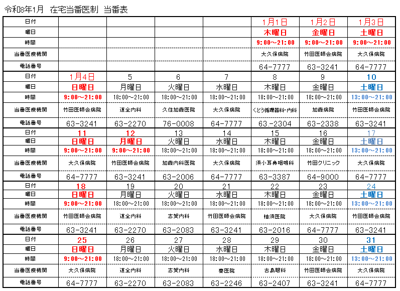 竹田市医師会では、在宅当番医制事業を竹田市より委託を受けて実施しています。